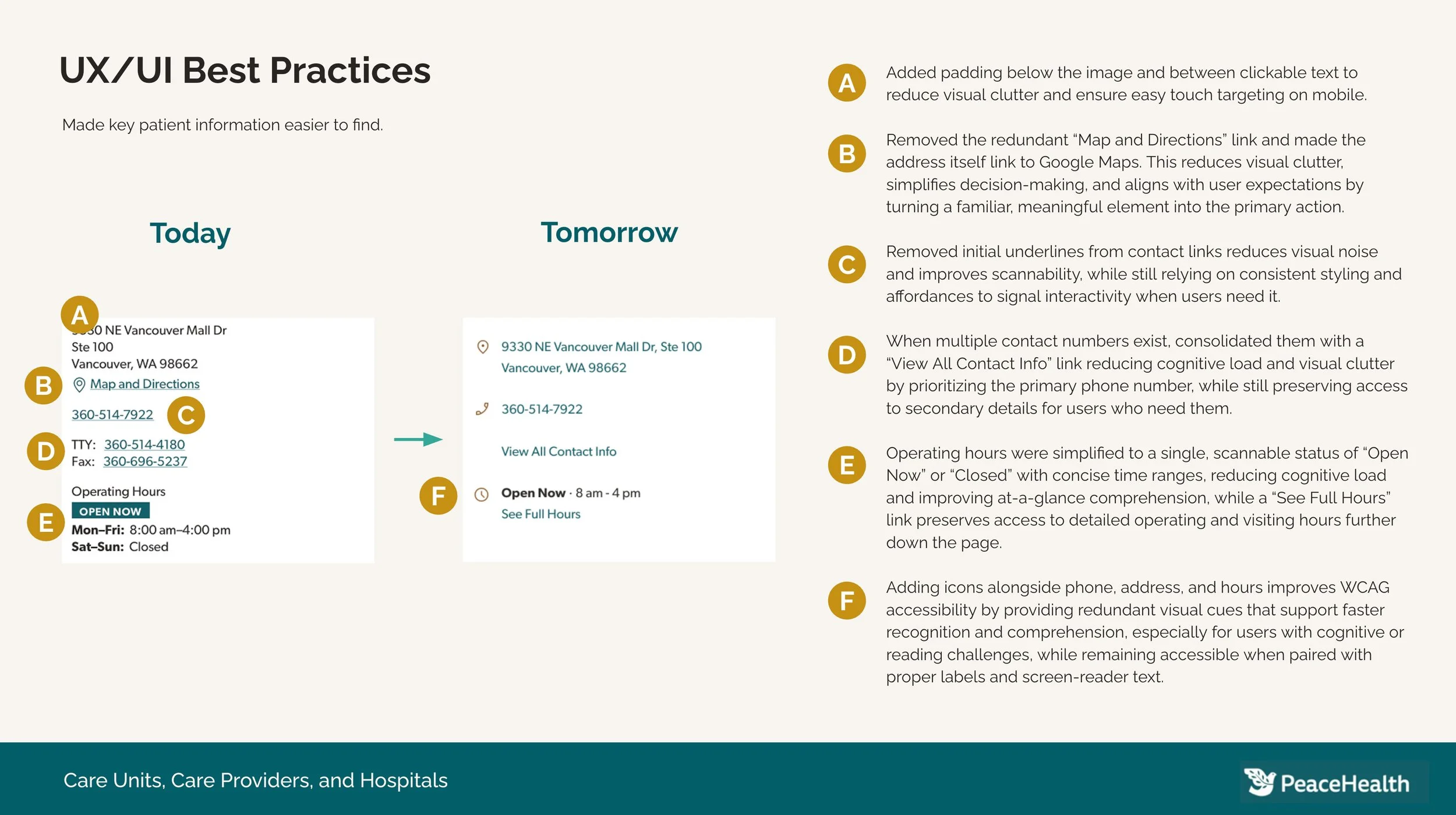 This work represented a shift in mindset, from one-time redesigns to continuous, data-driven UX evolution. By grounding decisions in patient intent, behavioral signals, and best-practice patterns, the team created a scalable foundation that improves care discovery today while enabling PeaceHealth to adapt as patient needs, content, and digital capabilities evolve. Rather than redesigning pages in isolation, the engagement reframed PeaceHealth.org as a connected decision-support system for millions of patient journeys.